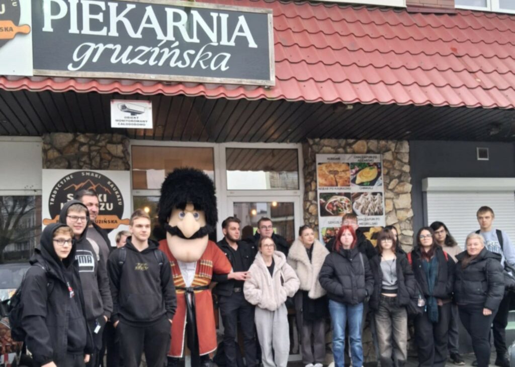 kolendra, estragon, mięta), esencjonalne przyprawy, świeże owoce i warzywa oraz orzechy włoskie jako kluczowy składnik. Uczniowie mieli okazje obserwować jak powstają tradycyjne dania mączne kuchni gruzińskiej tj. lawasz, chaczapuri oraz placki i podpłomyki kukurydziane. Nie zabrakło również ujawnienia przez Pana Aleksandra (właściciela piekarni oraz burgerowni) wielu ciekawostek i tajemnic kulinarnych Kaukazu. Następnie uczestnicy odwiedzili burgerownie, gdzie mogli obserwować i wykonać słynne fast-foody. Omówiono, także działania operacyjne i logistyczne bistro oraz piekarni. Wizyta studyjna była niewątpliwie ciekawą podróżną kulinarną do zakątków Gruzji oraz inspiracją do odkrywania kuchni świata.