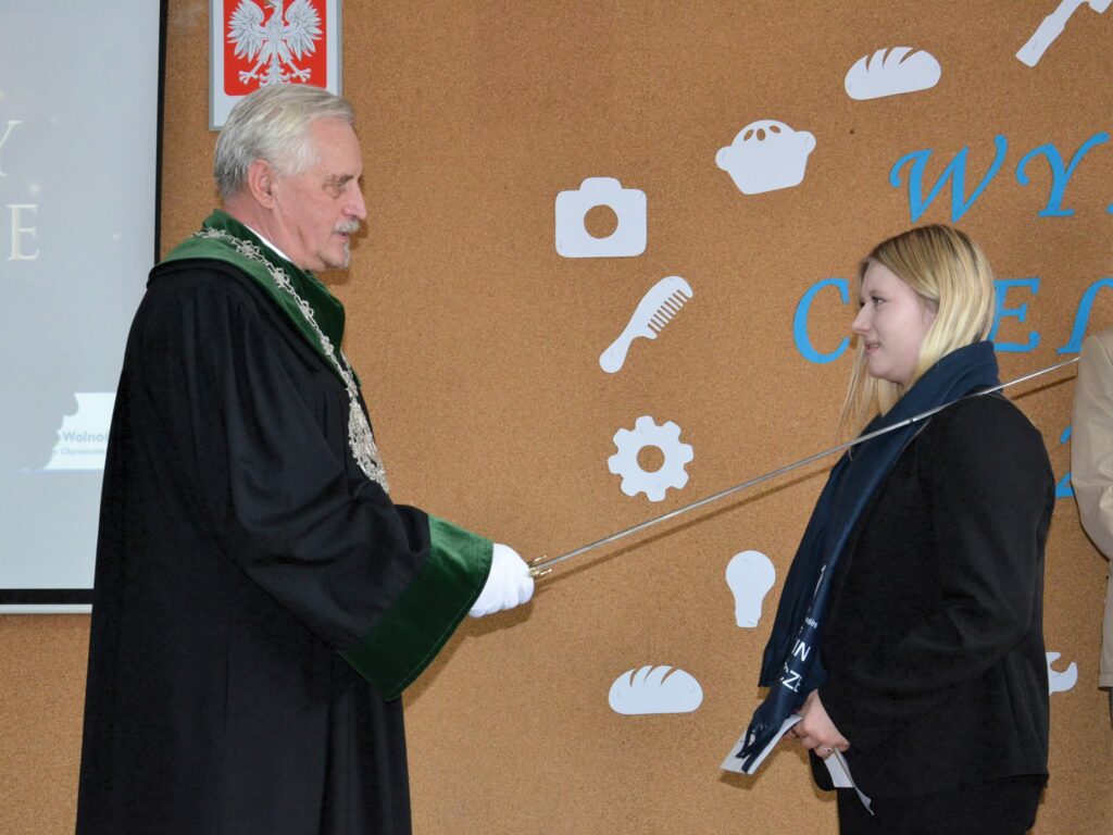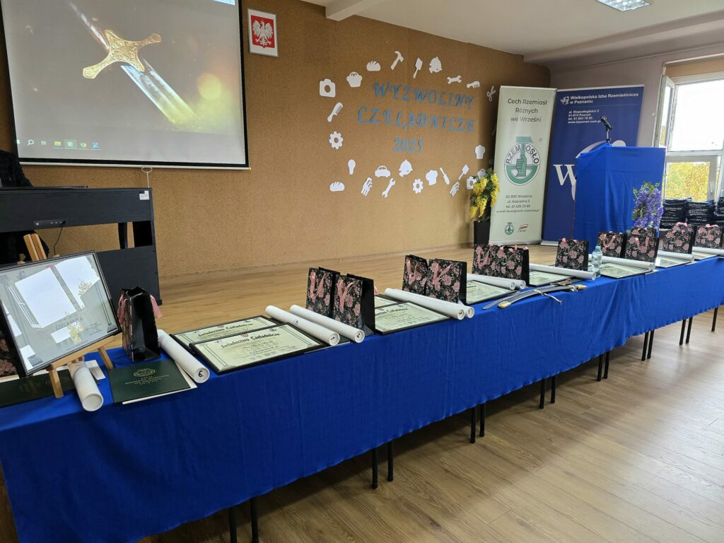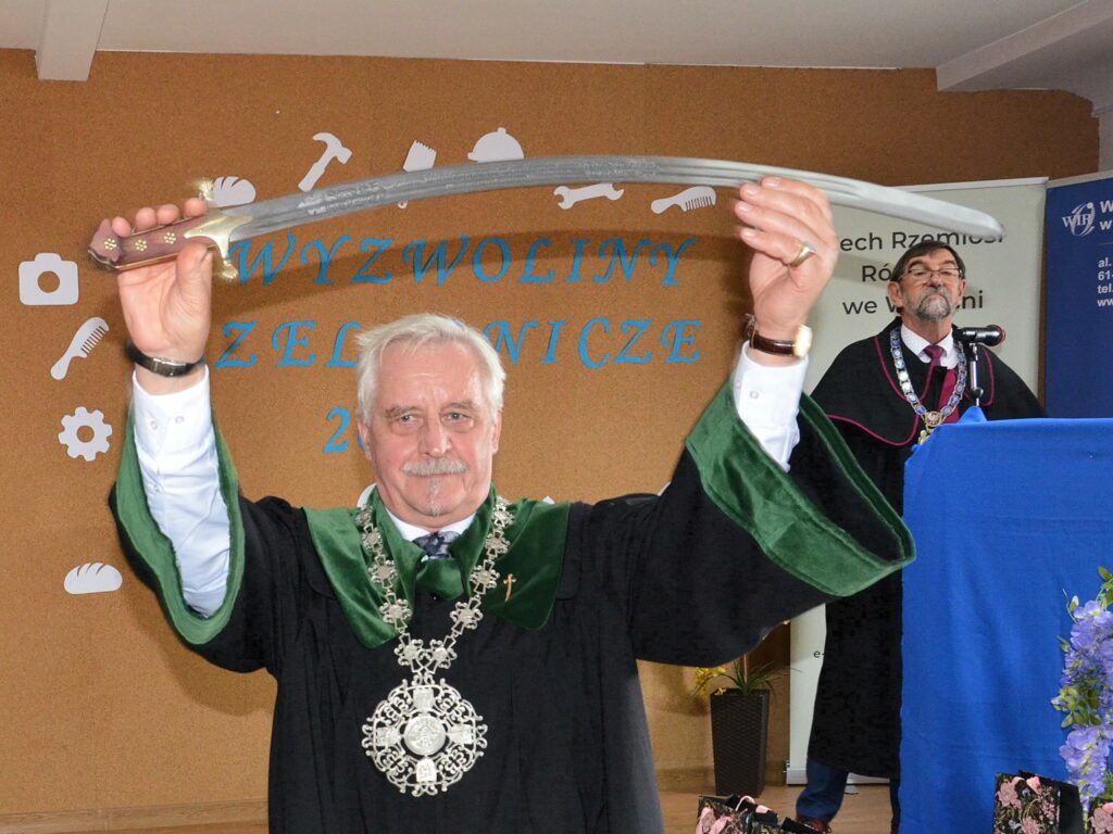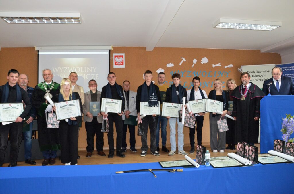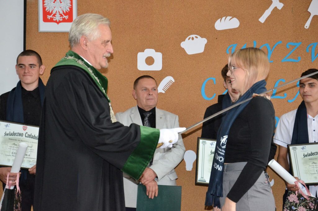 W piątek 17.10.2025 odbyły się w naszej szkole „Wyzwoliny czeladnicze”. Wydarzenie ważne dla tegorocznych absolwentów Branżowej Szkoły I Stopnia, którzy egzaminy czeladnicze w swoich zawodach zdawali przez Izbę Rzemieślniczą. W trakcie uroczystości każdy absolwent odbierając świadectwo został włączony w grono czeladników. Pasowania, poprzez położenie na ramieniu absolwenta szabli Jana Kilińskiego, dokonywał prezes Wielkopolskiej Izby Rzemieślniczej Marek Skoraszewski. Wcześniej o dokonanie ceremonii pasowania do prezesa Izby zwróciła się Alicja Kmieć, która uzyskała najwyższą ocenę z egzaminu czeladniczego. Poniżej zapraszamy na fotorelację z tego wydarzenia.